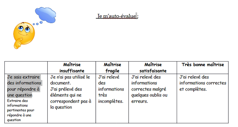 Quand ton travail est fini, tu peux te servir de ce tableau pour t'évaluer : quel résultat aurais-tu eu lors d'une évaluation ?????